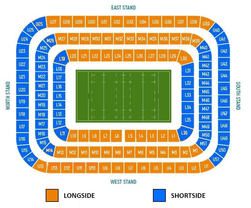 CATEGORIES : Catégorie 1 : Tribune latérale (en orange sur le plan) Catégorie 2 : Virage (en bleu sur le plan)