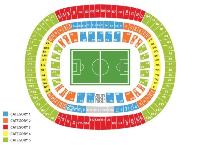 CATEGORIES : Premium : Tribune Latérale Centrale (Premium – en jaune sur le plan) Catégorie 1: Tribune Latérale (Long Side – en bleu sur le plan) Catégorie 2 : Virage (Short Side – en rouge sur le plan)