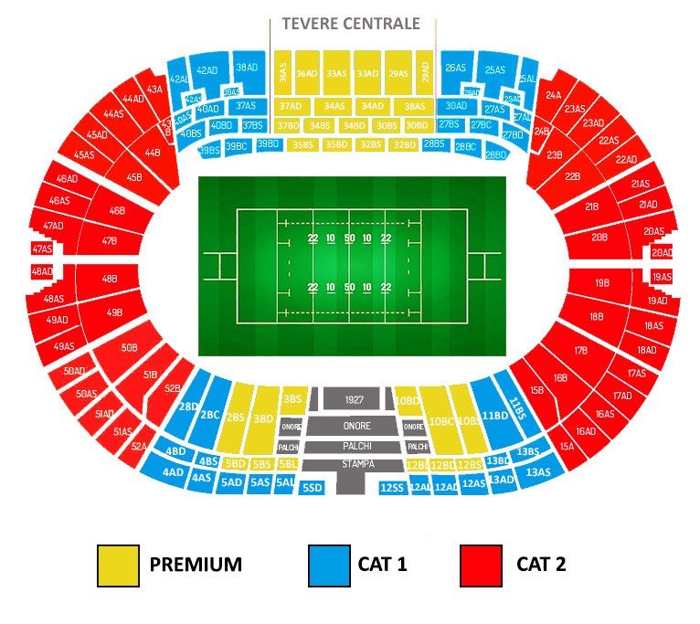 CATEGORIES : Premium : Tribune Latérale Centrale (Premium – en jaune sur le plan) Catégorie 1: Tribune Latérale (Long Side – en bleu sur le plan) Catégorie 2 : Virage (Short Side – en rouge sur le plan)